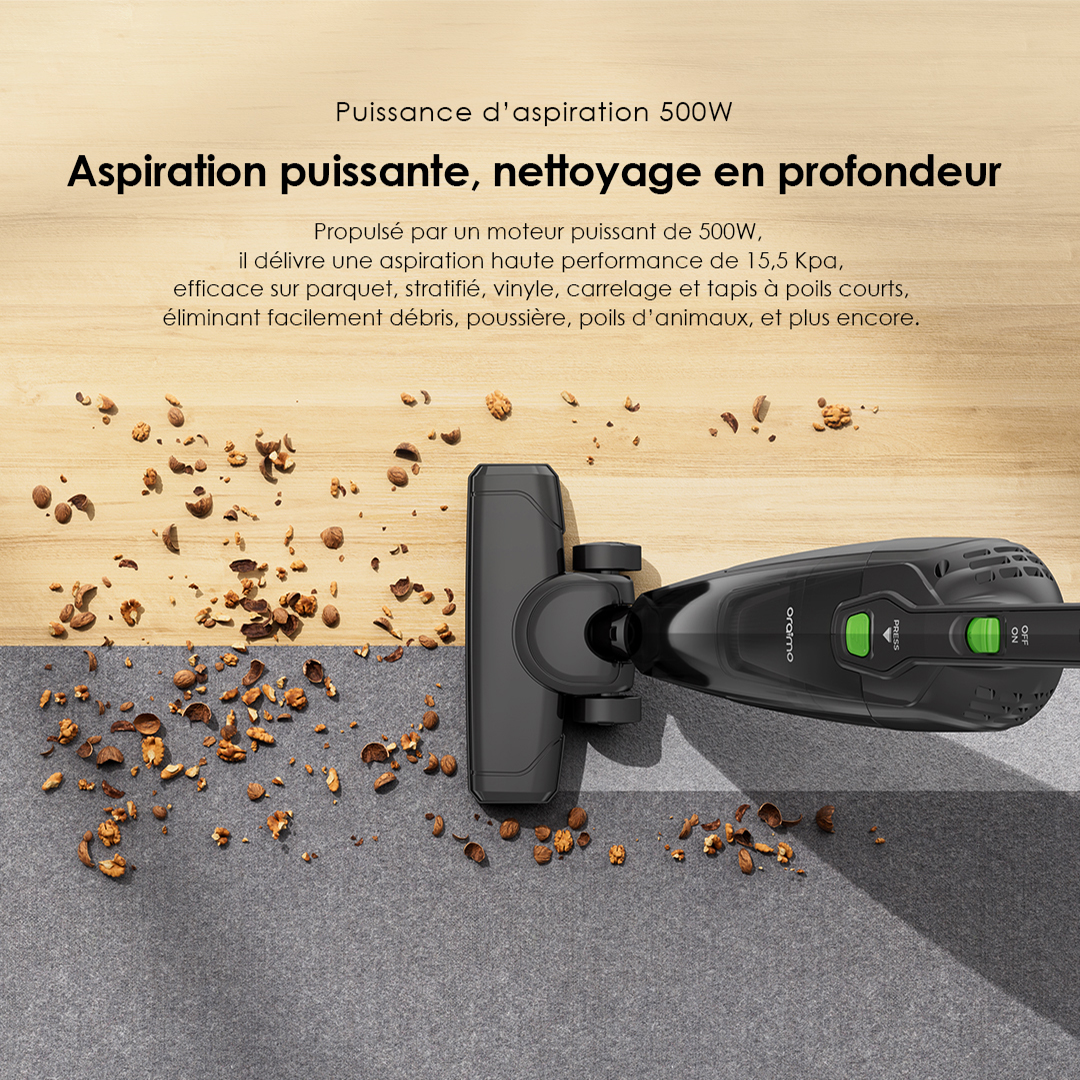 Propulsé par un moteur puissant de 500W, il délivre une aspiration haute performance de 15,5 Kpa, efficace sur parquet, stratifié, vinyle, carrelage et tapis à poils courts, éliminant facilement débris, poussière, poils d’animaux, et plus encore.
