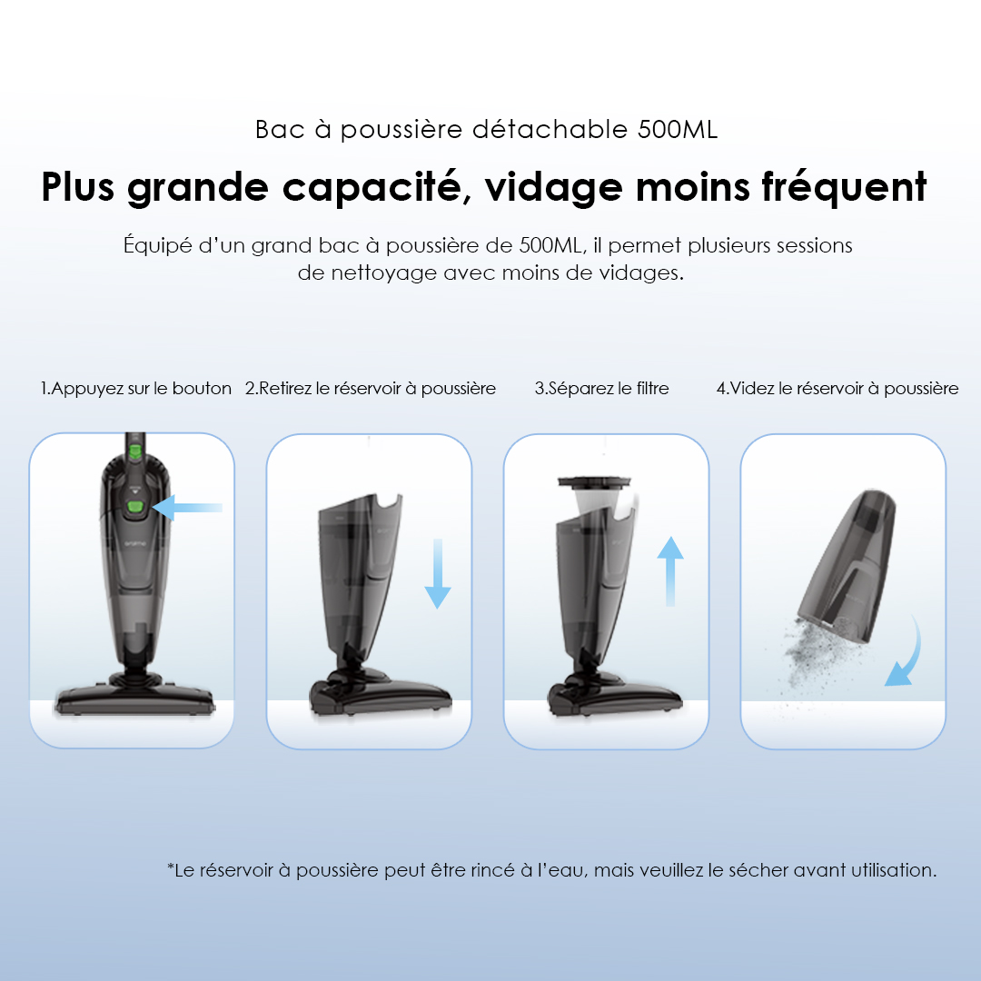 Équipé d’un grand bac à poussière de 500ML, il permet plusieurs sessions de nettoyage avec moins de vidages.